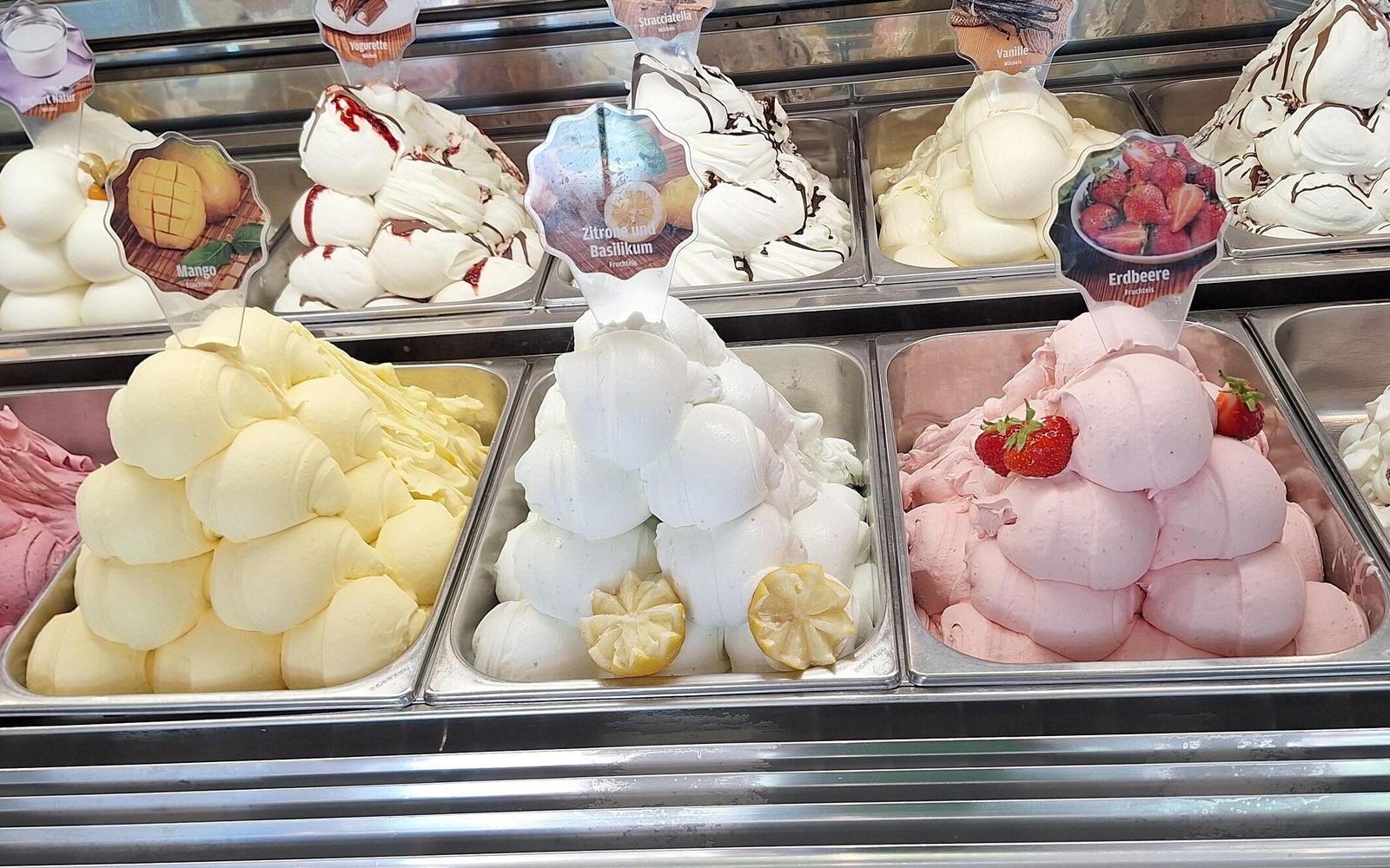 Hier gibt es insgesamt 16 verschiedene Eissorten, die täglich frisch produziert werden. Ob salziges Karamell, Crème Brûlée, Yogurette, Joghurt-Mandarine oder die klassischen Sorten Erdbeere, Vanille und Stracciatella – für jeden Geschmack ist etwas dabei. Besonders gefragt sind auch vegane Sorten wie Tropical, Waldbeere, Mango und Bitterschokolade. Bei den Kindern sind Nutella und das Weiße Eis besonders beliebt. In dieser Saison sind die Sorten Dubai-Schokolade, Zitronentorte, Mandel und „italienische Oper“ – eine köstliche Kreation aus verschiedenen Nüssen und Pistazien – die Highlights. Das Eis wird täglich frisch hergestellt, sodass die Qualität stets garantiert ist.