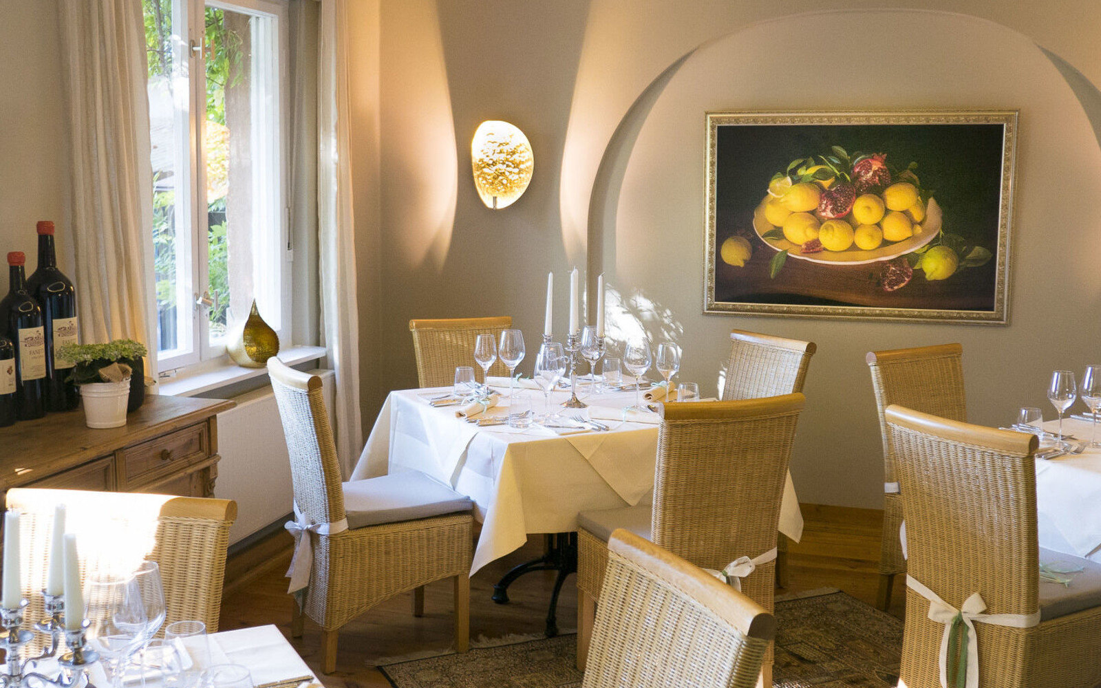 Hier ist jedoch nicht nur die Küche etwas Besonderes – in den Sommermonaten speisen die Gäste im stilvoll gestalteten mediterranen Kräutergarten, in den kühleren Jahreszeiten bietet der Salon mit Kachelofen und die Bibliothek mit mehr als 600 Kochbüchern aus aller Welt ein inspirierendes Ambiente.