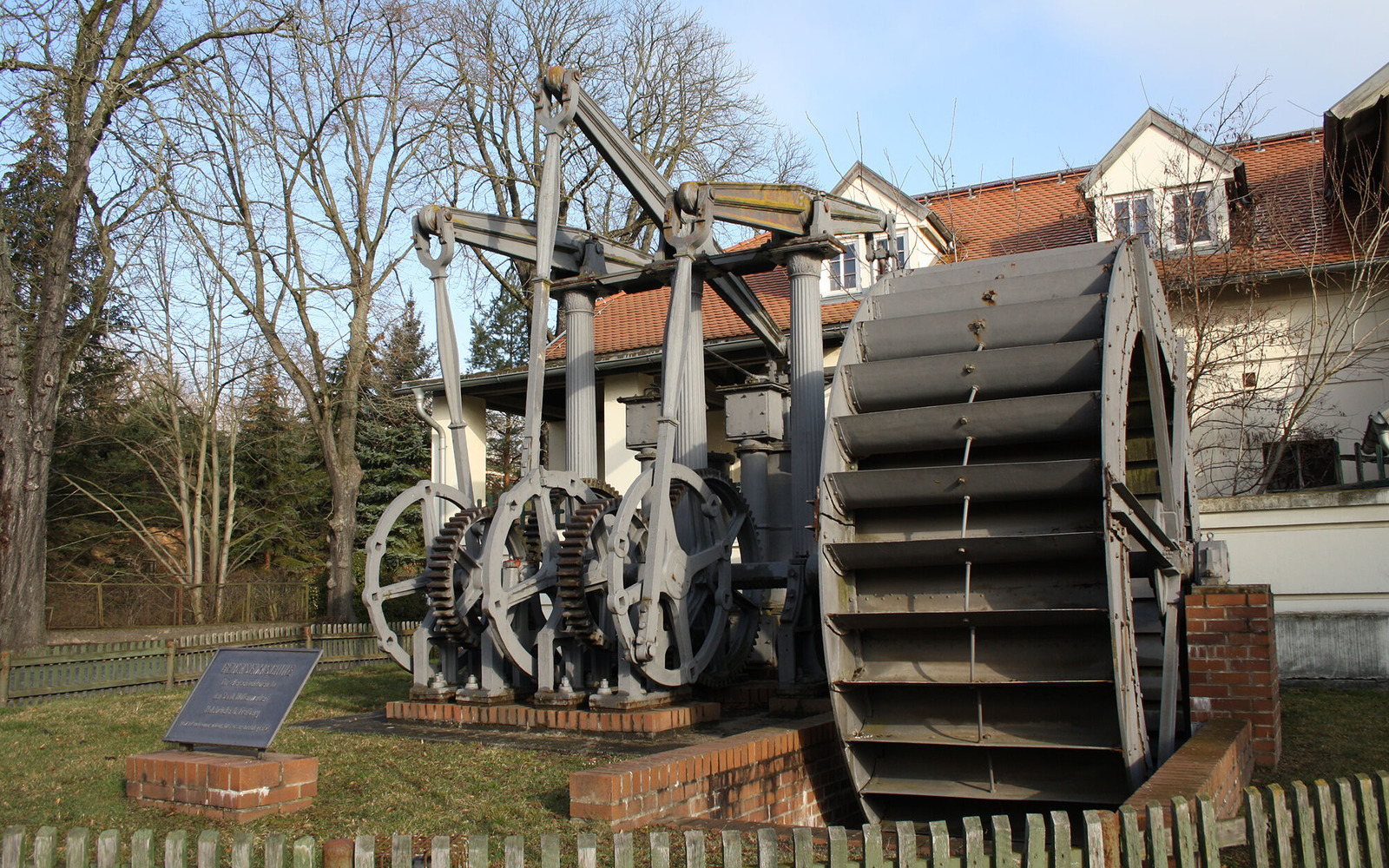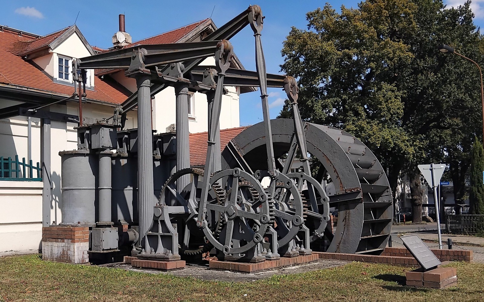 Die Balancier-Zylinder-Gebläsemaschine am Eingang des Werkhofes wurde 1837 in Lauchhammer für ein Hüttenwerk in Sachsen gefertigt. Das 30 Tonnen schwere technische Denkmal kam 1929 wieder zurück nach Lauchhammer. Damals wie heute beeindruckt die Maschine mit ihren gewaltigen Schwinghebeln und dem Wasserrad von 4,40 Metern Durchmesser.