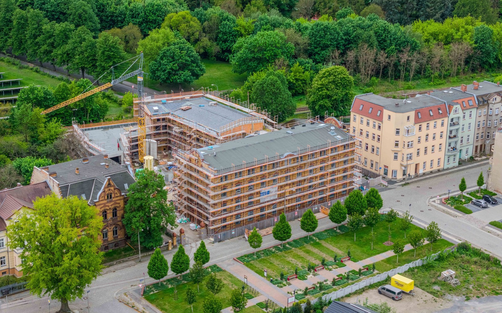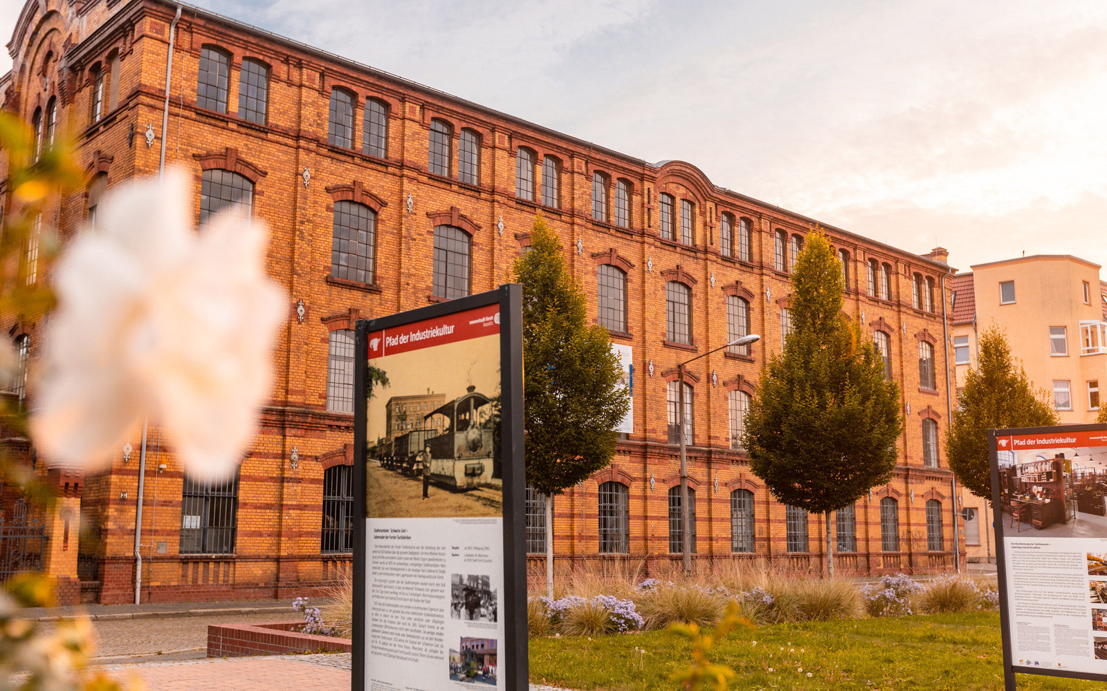 Wegbeschreibung: Seit der Wende 1989 sind insbesondere im Norden der Stadt, entlang des Mühlgrabens, viele der vormals gewerblich genutzten Gebäude brach gefallen und von baulichem Verfall bedroht. Um das architektonische Erbe zu erhalten, darüber zu informieren und es stärker in das Blickfeld der Menschen zu rücken, wurde der „Pfad der Industriekultur“ ins Leben gerufen, der ganz in der Nähe des Bahnhofs beginnt. Der Pfad thematisiert die Industriegeschichte des Tuchgewerbes, die das Stadtbild bis heute prägt.