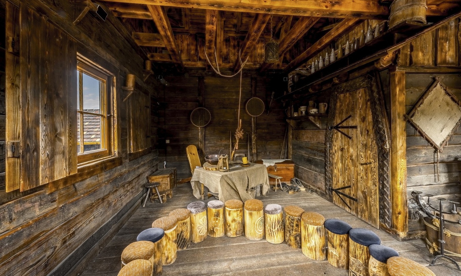 Übernachten: Den Besuchern stehen fünf themenbezogene, individuell ausgestattete Ferienhäuser mit Kamin zur Übernachtung zur Verfügung.
