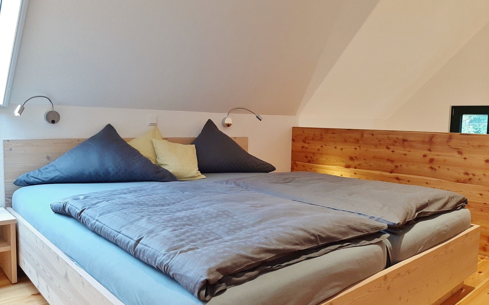 Der Ferienhof besteht aus 2 Ferienhäusern mit insgesamt 3 großzügigen, komfortablen Ferienwohnungen, die mit 4 Sternen klassifiziert sind. Das Feriendoppelhaus mit 2 identischen Ferienwohnungen (je 35 m²) ist für jeweils 2 Personen ausgelegt, es eignet sich daher auch gut für befreundete Paare. Beide Ferienwohnungen verfügen im Wohnbereich über eine modern integrierte Küchenzeile, Essbereich und eine Eckcouch. In der oberen Etage befindet sich eine offene Galerie mit einem Doppelbett und großen Kleiderschrank, der ideale Platz zum Träumen.