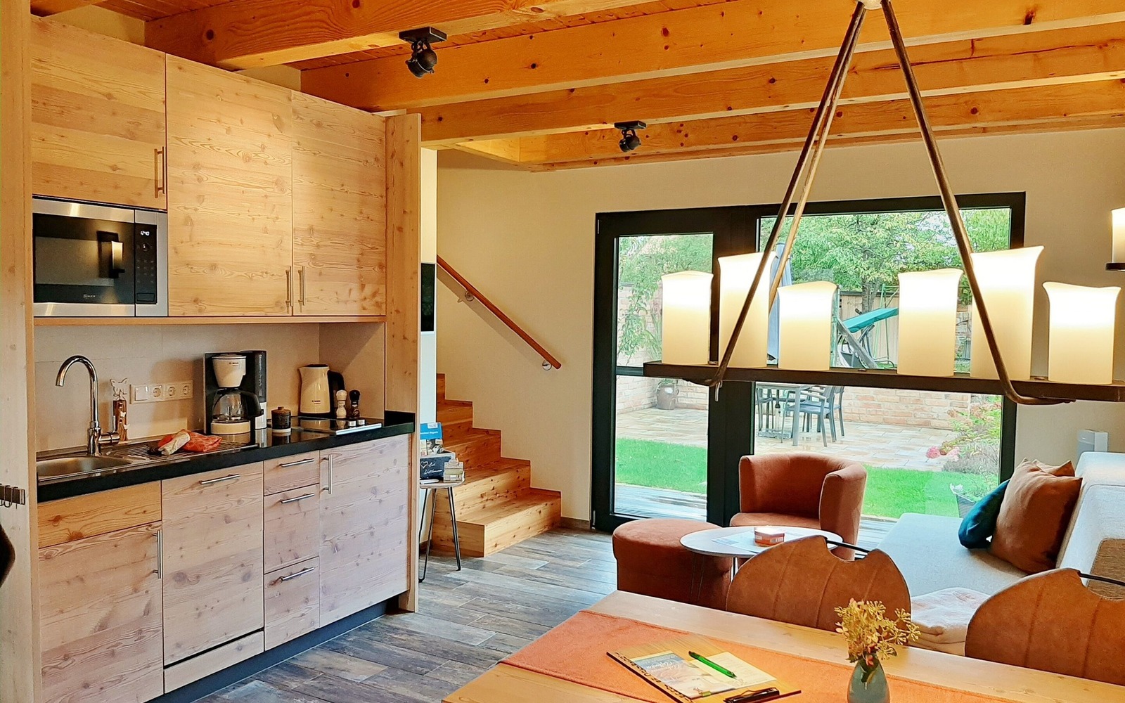 Im großen Ferienhaus (55 m²) finden bis zu 4 Personen Platz und ist im Erdgeschoss barrierefrei begehbar. Das Haus besitzt einen Wohnbereich mit integrierter Küchenzeile, einem großen modernen Badezimmer mit Dusche sowie 2 Schlafräumen im Obergeschoss. Jede Ferienwohnung verfügt über eine eigene Terrasse mit Sitzmöglichkeiten. Pkw- und Fahrradstellplätze sind für Gäste vorhanden.