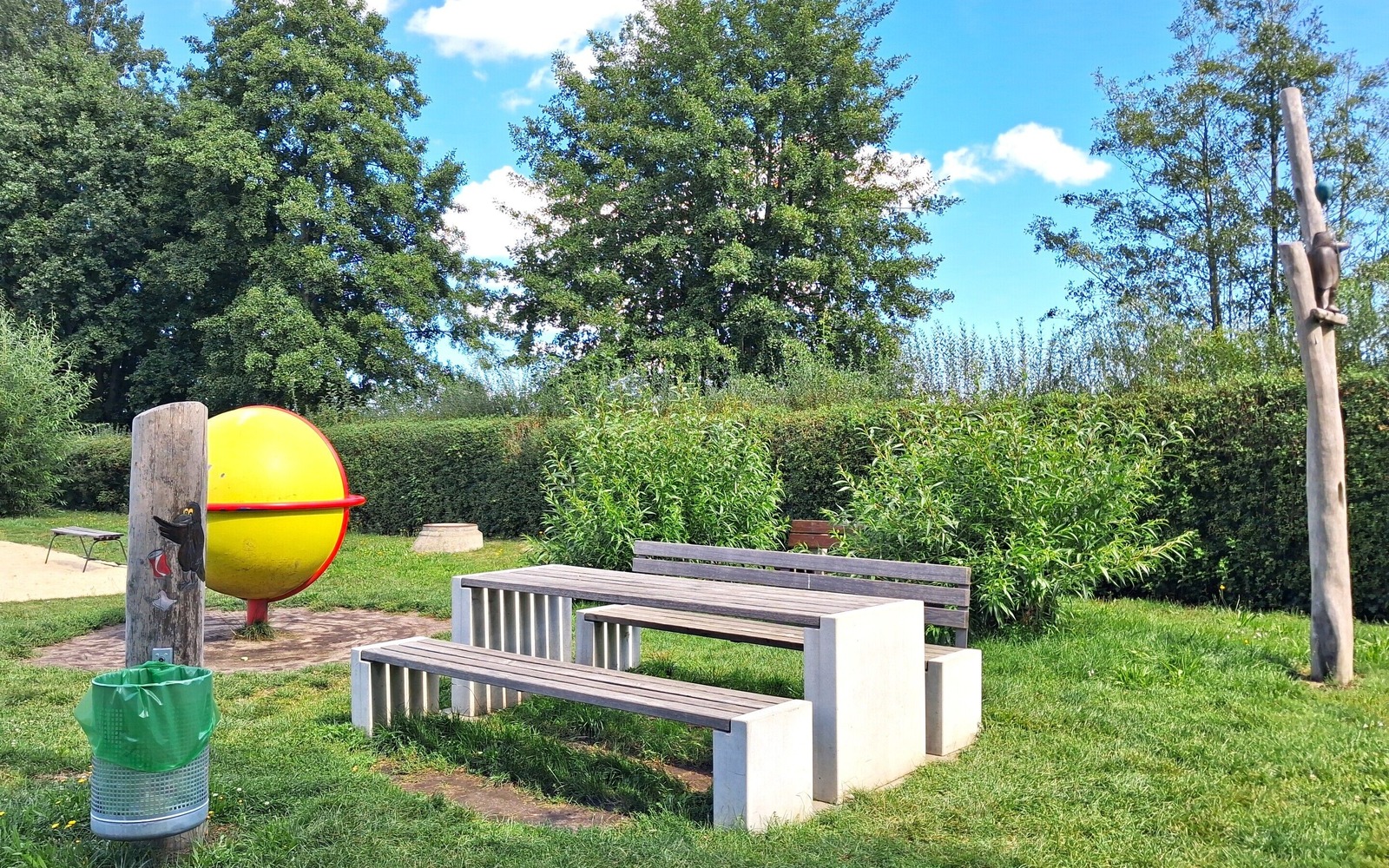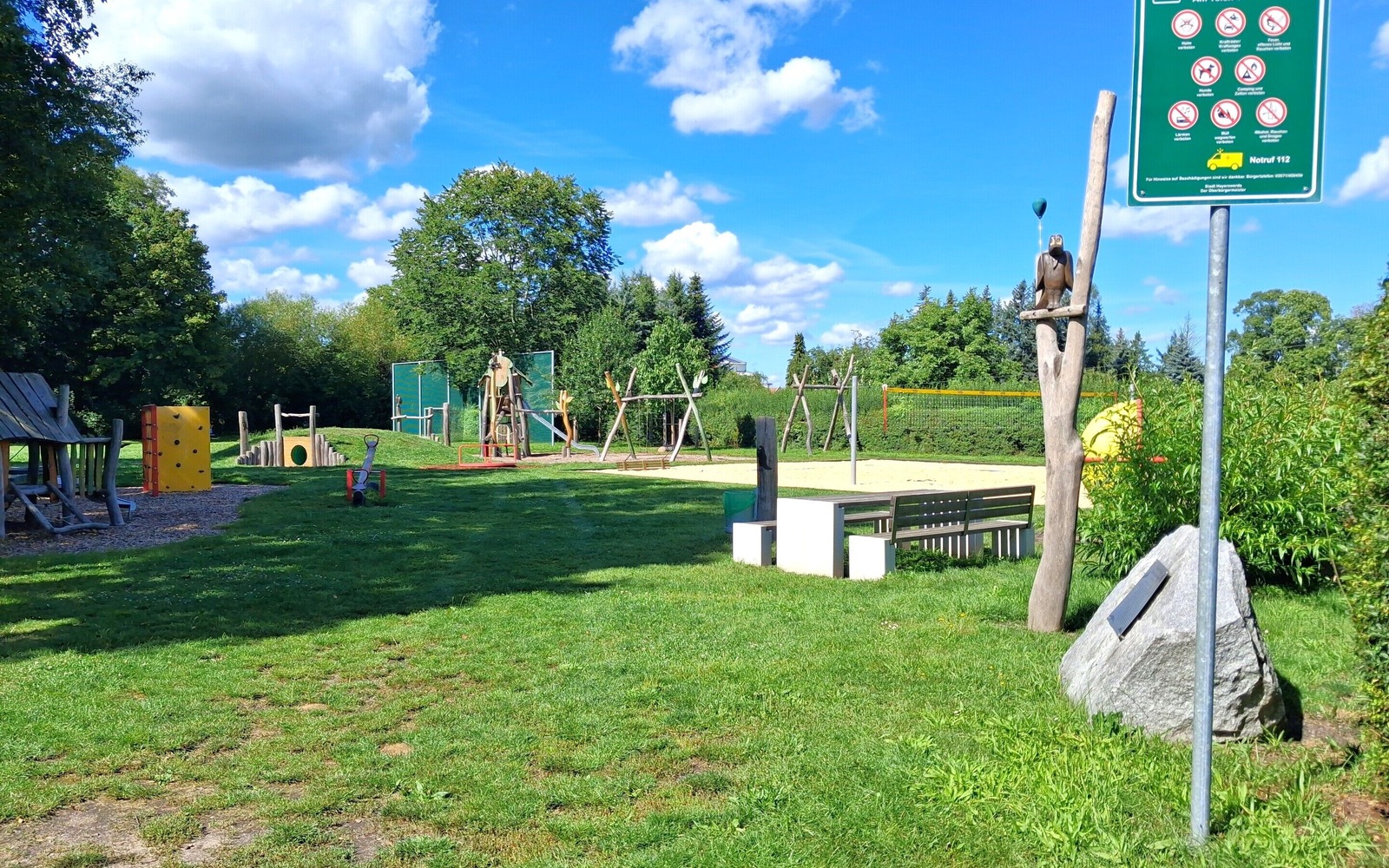Moderne Sitzgelegenheiten laden zum Verweilen ein und bieten Platz für eine Pause oder ein Picknick. Die gepflegte Rasenfläche, Hecken und Bäume sorgen für eine naturnahe Atmosphäre. Am Eingang informiert eine Hinweistafel über die Spielplatzregeln.