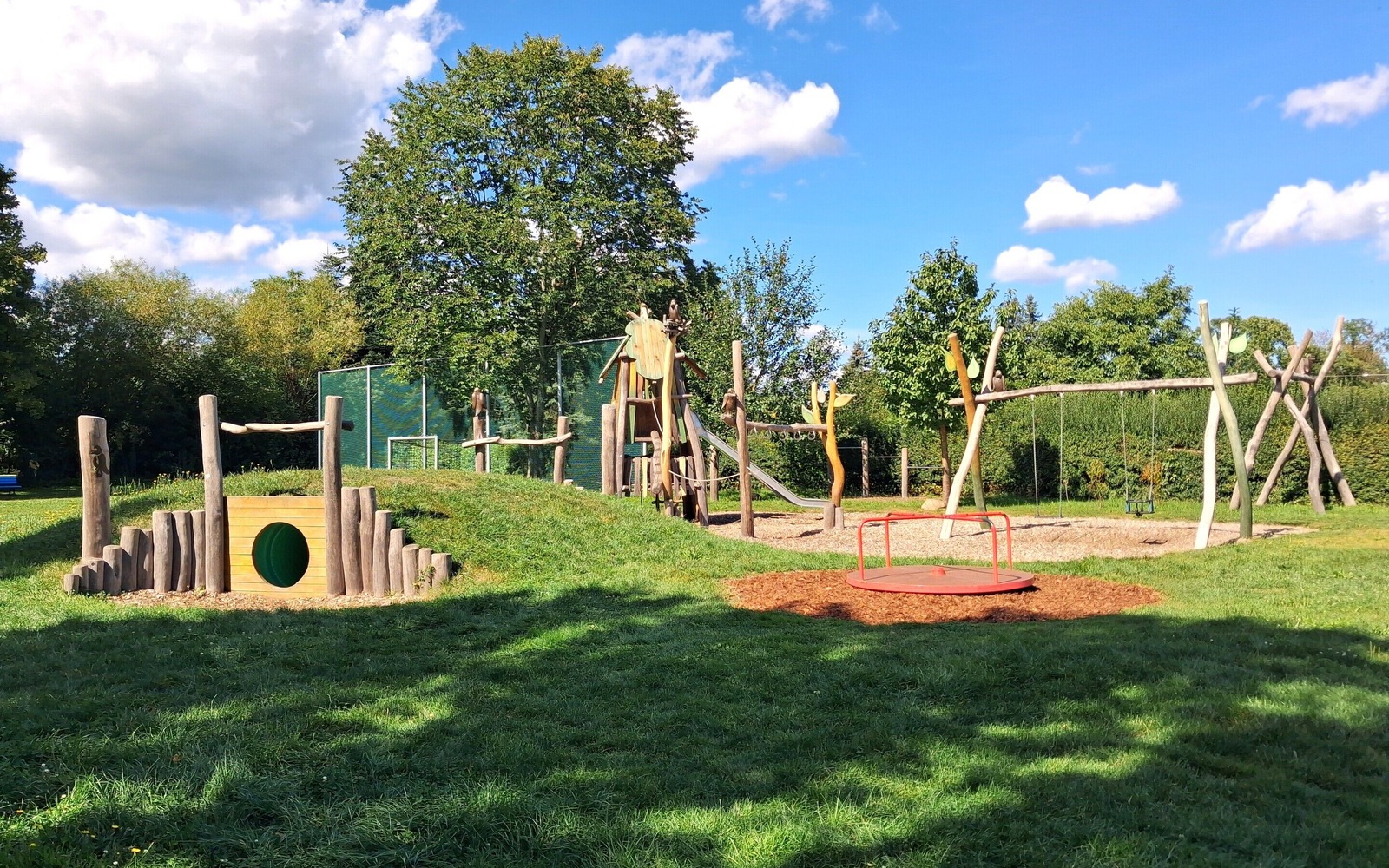 Der Spielplatz „Rabennest“ wurde am 1. Juni 2022 feierlich eröffnet und liegt idyllisch im Grünen. Die großzügige Anlage bietet abwechslungsreiche Spiel- und Bewegungsmöglichkeiten für Kinder verschiedener Altersgruppen. Zu den Highlights gehören Kletter- und Balanciergeräte aus robustem Holz, Schaukelanlagen, eine Wippe sowie eine auffällige gelbe Spielkugel zum Drehen. Außerdem gibt es einen Sandspielbereich, eine kleine Boulderwand und ein Holzhäuschen, das zum Spielen einlädt.