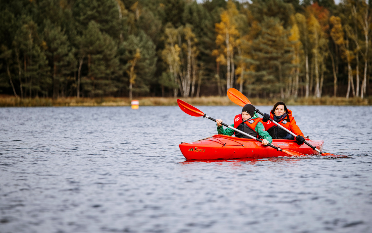 In Leipzig waren wir schon mal mit dem Ruderboot unterwegs, aber gepaddelt sind wir noch nie. Die Wege und der Steg am Hafencamp sind schön breit. Der Steg hat sogar einen speziellen Lift. Damit gleite ich ohne Probleme ins Boot. Das sieht vielleicht ein bisschen komisch aus, ist aber ein sehr praktisches Hilfsmittel, um in die Boote, in eine Segelyacht oder aufs Floß zu kommen. Eine Mitarbeiterin des Hafencamps hilft mir beim Einsteigen ins Kanu. Noah sitzt vorn, ich hinten. Und es geht besser als gedacht. Wir finden ziemlich schnell einen gemeinsamen Rhythmus. Anders als in den Beinen habe ich in den Armen richtig viel Kraft. Wir paddeln munter drauf los. Das macht riesigen Spaß! Und uns wird schön warm. In den kleinen Paddelpausen genießen wir das wunderschöne Landschaftsbild: Die Bäume legen so langsam ihr buntes Herbstkleid an, und über uns tönen Wasservögel. Anfangs hatte ich Respekt vor dem großen See, aber ich fühle mich total sicher. Und richtig frei! Noah findet paddeln „cool“ und legt sich mächtig ins Zeug.