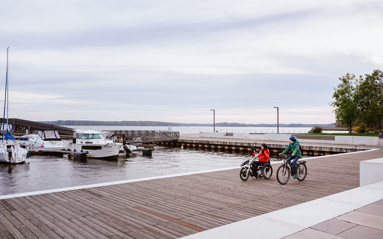 Die Sonne hat uns geweckt. Bei dem schönen Wetter drinnen frühstücken? Nein. Wir möchten viel lieber den Morgen an der frischen Luft genießen. Eine Rampe führt zu den Tischen nach draußen. Noah drängelt ein bisschen – er will unbedingt mit dem Rad los und die Gegend erkunden. Ich kopple das Handbike vorn an meinen Rollstuhl und los geht’s. Aber weit kommen wir nicht, denn nur ein paar Meter vom Hotel entfernt liegt der Stadthafen Senftenberger See. Die breiten, ebenen Wege des Hafengeländes finde ich gut. Es macht Spaß, dem Treiben hier zuzuschauen, wenn die Kapitäne ihre Yachten in den Hafen steuern.