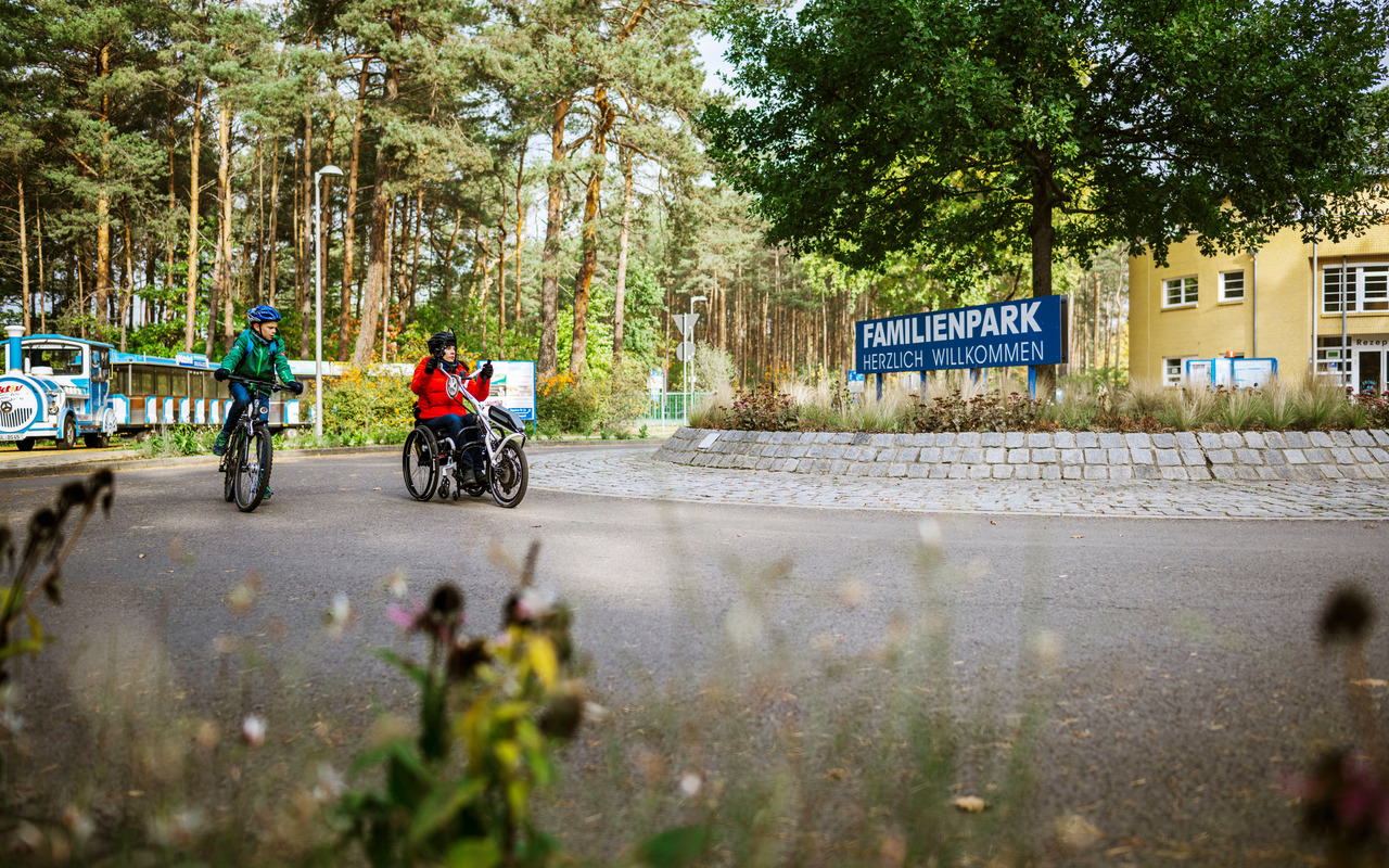 Als nächstes kommen wir am Familienpark Senftenberger See vorbei. Den schauen wir uns gleich mal genauer an, denn Noah sieht schon von weitem viele Kinder und weiß sofort, hier kann man jede Menge Spaß erleben. Im Familienpark gibt es neben Spielplätzen und vielen Spiel- und Sportangeboten auch barrierefreie Ferienhäuser. Meinen Sohn zieht es zum Tischtennis. Das ist nicht ganz so meins, aber eine Runde spiele ich mit. Auch im Familienpark sind die Wege asphaltiert und auch hinunter zum See geht es auf einem befestigten Weg. Der ist mir aber ein bisschen unangenehm und Noah hilft mir. Dann fahren wir weiter um den Senftenberger See. Herrlich grün ist es unterwegs, und der Wald spendet Schatten. Immer wieder gibt der Weg schöne Blicke auf den See frei.