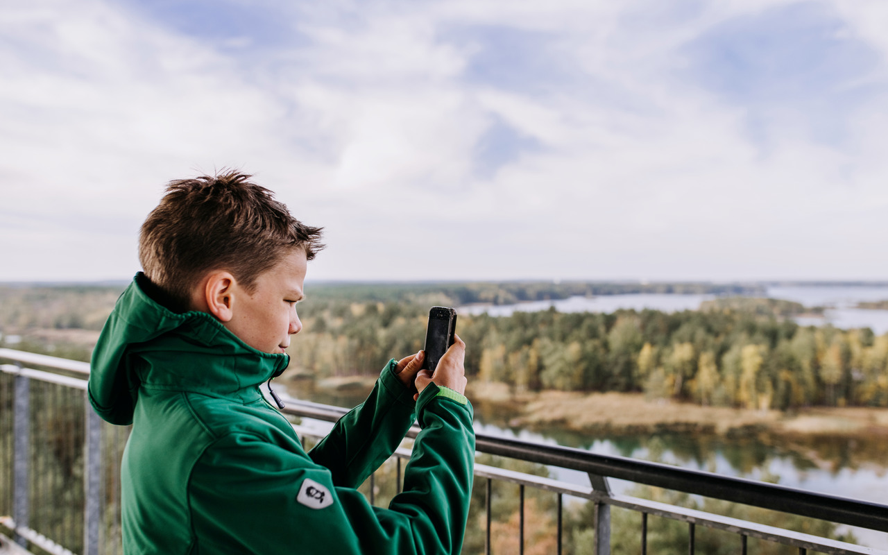 Noah wollte unbedingt noch einmal komplett um den See fahren. Die gut gut 17 Kilometer sind für uns kein Problem, denn wir lieben Radfahren. Die gut ausgebauten und größtenteils ebenen Radwege sind hier abseits von großen Straßen und führen durch die schöne Natur. Zwischen Hafencamp und Südsee entdecken wir mitten im Wald einen stählernen Aussichtsturm und halten an. Ich kann nicht rauf, aber Noah läuft die Stufen hoch und macht für mich aus 31 Metern Höhe Handyfotos vom Blick auf den See und seinen geschützten Inseln mittendrin. Wie still der See jetzt im Oktober daliegt! Weiter geht es über Niemtsch und entlang der Schwarzen Elster in Richtung Senftenberg. Ich genieße die Zeit mit meinem Sohn sehr und freue mich, dass wir beide hier so aktiv unterwegs sein können. Morgen geht es wieder zurück nach Leipzig.