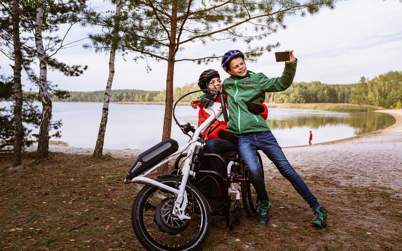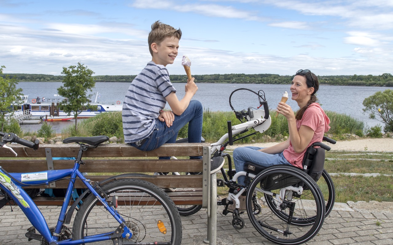 Die aus Leipzig kommende Mareen und ihr Sohn Noah fuhren gleich zweimal nach Senftenberg ins Lausitzer Seenland, um auszuspannen und ohne Barrieren aktiv zu sein. Denn die 40-Jährige hat MS, Multiple Sklerose. Die chronische Entzündung des Nervensystems ist nicht heilbar, jedoch mit Medikamenten und Sport auszubremsen. Mareen kann laufen, nutzt aber für längere Wege den Rollstuhl bzw. den „helfenden Begleiter“, wie sie ihn nennt.
