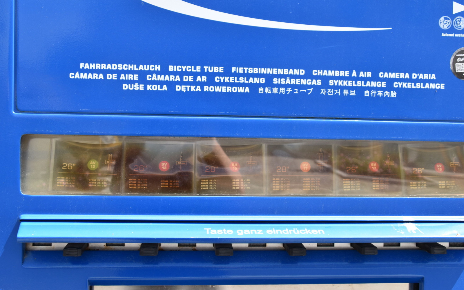 Der Schlauchautomat befindet sich an der Außenfassade des Fahrradgeschäfts Zweirad-Center Lieske. Rund um die Uhr sind dort Fahrradschläuche in verschiedenen Größen erhältlich.