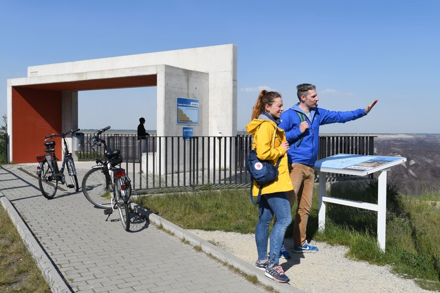 Aussichtspunkte entlang der Strecke geben den Blick auf imposante Weite und turmhohe Tagebaugeräte in den wenigen noch betriebenen Kohleabbaufeldern frei. Wem ein Blick aus der Ferne nicht genügt, der kann zu Erlebnistouren in den Tagebau mit seinen riesigen Baggern aufbrechen.
