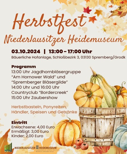 Das traditionelle Herbstfest im Niederlausitzer Heidemuseum lädt zu einem bunten Markttreiben ein. Besucher können sich auf eine Vielfalt regionaler Erzeugnisse wie Brot, Ziegenkäse und Imkereiprodukte freuen. Neben kreativen Ständen mit selbstgenähter Kinderkleidung, Porzellan und Holzdekoration bietet die Veranstaltung auch Unterhaltung für die ganze Familie. Höhepunkte sind die Square Dance-Aufführungen des Countryclubs "Bordercreek" und musikalische Darbietungen der Jagdhornbläsergruppe "Am Hornower Wald" sowie der "Spremberger Bläsergilde". Kinder können sich auf eine zauberhafte Show mit Ballonkünstler Dietmar Schurig, Ponyreiten, Herbstbasteln sowie Eis, Popcorn und Zuckerwatte freuen. Zudem besteht die Möglichkeit, das Heidemuseum und die Sonderausstellung "Leseland DDR" zu besichtigen.