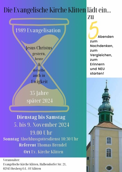 Die evangelische Kirche Klitten lädt ein zu 5 Abenden zum Nachdenken, zum Vergleichen, zum Erinnern und NEU starten!