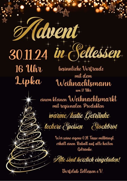 Ein kleiner Weihnachtsmarkt mit regionalen Produkten, Stockbrot an der Feuerschale, Getränke und Speisen und vor allem gemütliches Beisammensein. Der Dorfclub Sellessen e.V. läd herzlich an die Lipka (Gelände am Fahrradweg gegenüber der Feuerwehr) ein. Gegen 17 Uhr wird zur Freude der kleinen und großen Besucher der Weihnachtsmann erwartet. Übrigens: Wer seine eigene 0,2l-Tasse mitbringt, erhält Rabatt auf alle heißen Getränke.