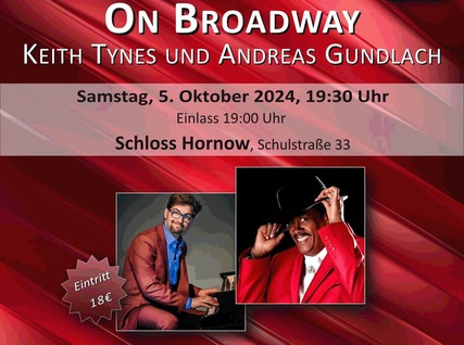 In den 1980er Jahren trat der Soul und Gospelsänger KEITH TYNES in den großen Musical Shows in New York auf. Mit "Hooray USA" hatte er sogar eine eigene Show in der Weltmetropole. Stil, Charme, Charisma und die unvergleichbare Präsentation von Songs machen diesen Sänger einzigartig. Begleitet wird er wird am Piano vom Pianisten und Komponisten ANDREAS GUNDLACH, der gewohnt charmant durch das musikalische Programm führen wird. So erwartet das Publikum ein außergewöhnlicher Abend mit traumhaften Melodien rund um die Metropole NEW YORK und ihrem musikalischen Schmelztiegel – dem Broadway; locker swingend und einzigartig im Vortrag mit dem großartigen Star-Sänger und dem Virtuosen am Piano.