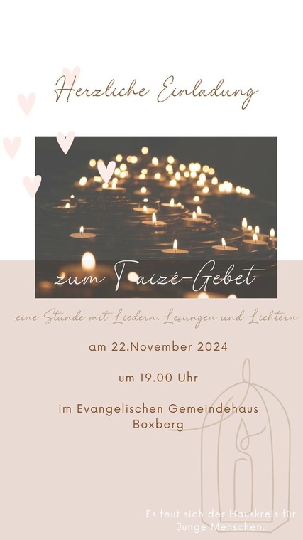 Sie werden herzlich eingeladen zum Taizé-Gebet und einer Stunde mit Liedern, Lesungen und Lichtern im evangelischen Gemeindehaus in Boxberg.