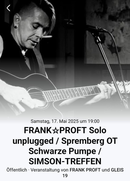 Ein unvergesslicher Abend für alle Musikliebhaber! Erlebt die authentische Kraft handgemachter Musik, wenn Frank Proft mit seinen gefühlvollen Melodien und ehrlichen Texten die Bühne im Spremberger Ortsteil Schwarze Pumpe erobert. Inmitten des einzigartigen SIMSON-TREFFENs erwartet euch ein musikalisches Highlight, das perfekt mit der Atmosphäre des Events verschmilzt. Lassen Sie sich von den gefühlvollen Rockballaden und unverfälschten Gitarrenklängen verzaubern, die direkt ins Herz gehen.