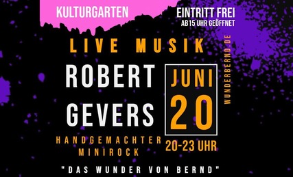 Genießt mit uns diesen tollen Abend (Schlechtwetter indoor) "das wunder von Bernd"Robert Gevers ist Singer-Songwriter aus Cottbus und die Stimme der Band "Das Wunder von Bernd". Mit seiner Gitarre spielt und singt er einen Abend lang über das Leben und die Liebe. Inzwischen blickt Gevers auf über zwanzig Jahre Bühnenerfahrung zurück und freut sich immer noch wie beim ersten Auftritt auf sein Publikum. Auf seiner Setlist finden sich neben selbst komponierten Songs auch der ein oder andere Coversong aus der Pop- und Rockgeschichte wieder. Mitsingen ausdrücklich erwünscht.