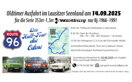 Die "Route 96 – Kult-Tour des Ostens" führt Wartburg-Fahrer durch das Lausitzer Seenland. Zugelassen sind nur Fahrzeuge der Serie 353er-1, 1.3er, Baujahre 1966 bis 1991. Startpunkt ist der Marktplatz in Spremberg, von wo aus die Rundtour über Hoyerswerda, Senftenberg, die IBA-Terrassen bis zum Cottbuser Ostsee verläuft. Geplant sind ein gemeinsames Mittagessen an der Dörrwalder Mühle, ein Besuch des Merzdorfer Turms sowie der Abschluss im Freizeitpark Teichland mit Aussichtsturm. Die Veranstaltung ist ein Treffpunkt für Liebhaber ostdeutscher Automobilgeschichte und bietet die Gelegenheit, klassische Wartburg-Modelle in Fahrt zu erleben. Eine Anmeldung mit Angabe von Fahrzeug und Mitfahrern ist im Vorfeld bis zum 20.08.25 erforderlich.