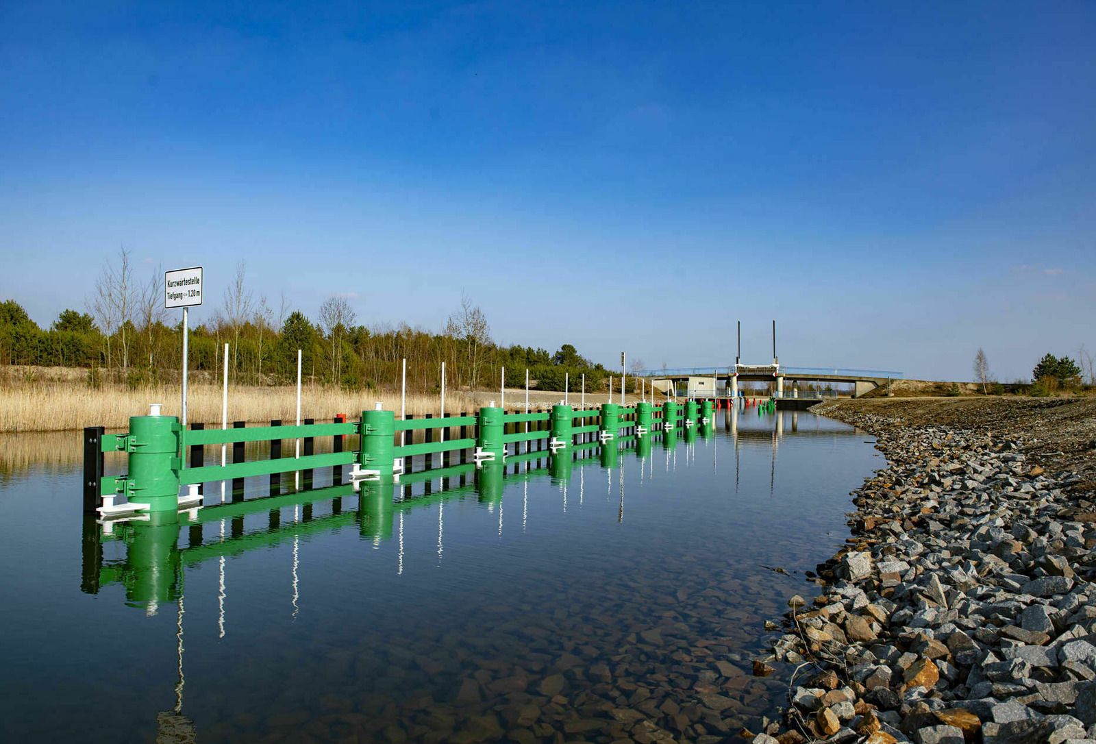 - Die Durchfahrt durch das Komplexbauwerk Wehr – Brücke ist eine Engstelle im Barbara-Kanal.