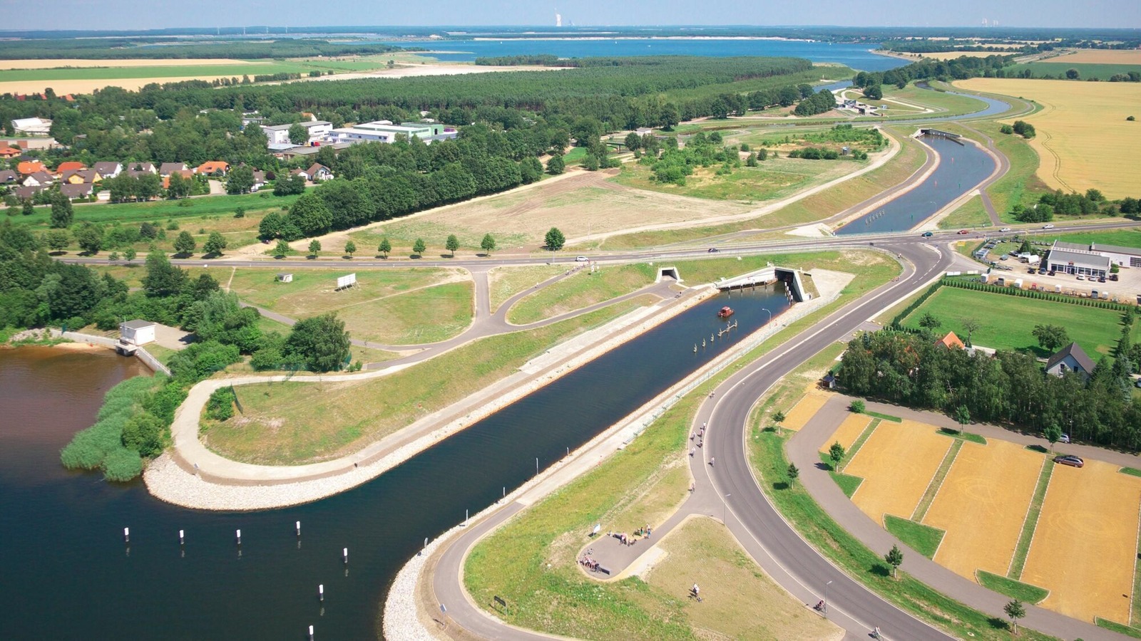 Der schiffbare Koschener Kanal verbindet den Senftenberger See und den Geierswalder See. Mit einer Länge von etwa 1.000 Metern unterquert er eine Bundesstraße und das Kanalbett eines Flusses (Schwarze Elster). Im Kanal sind für eine effiziente und sichere Nutzung Verkehrszeichen, Ampeln und Texttafeln angebracht. Außerdem ist aufgrund des Höhenunterschiedes der beiden Seen der Betrieb einer Schleuse notwendig. Diese Schleuse arbeitet im automatischen Selbstbetrieb mit zeitweiser Überwachung und Eingriffsmöglichkeit durch den Schleusenwart. Die Schleusenkammer hat eine nutzbare Länge von 29 x 6 Meter.