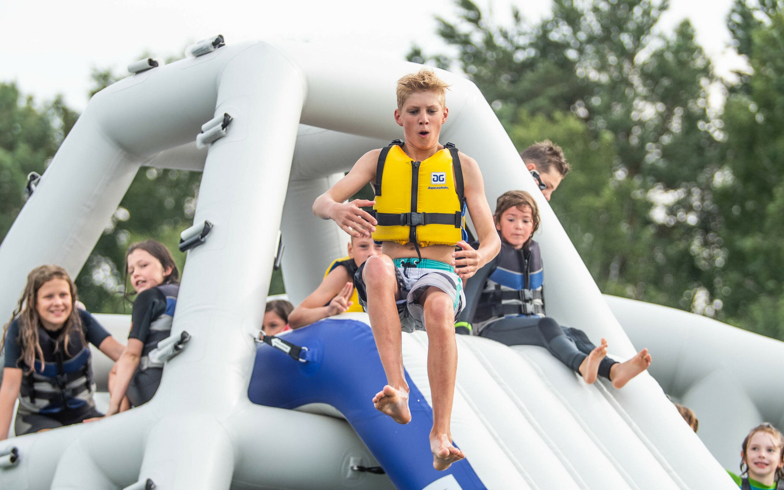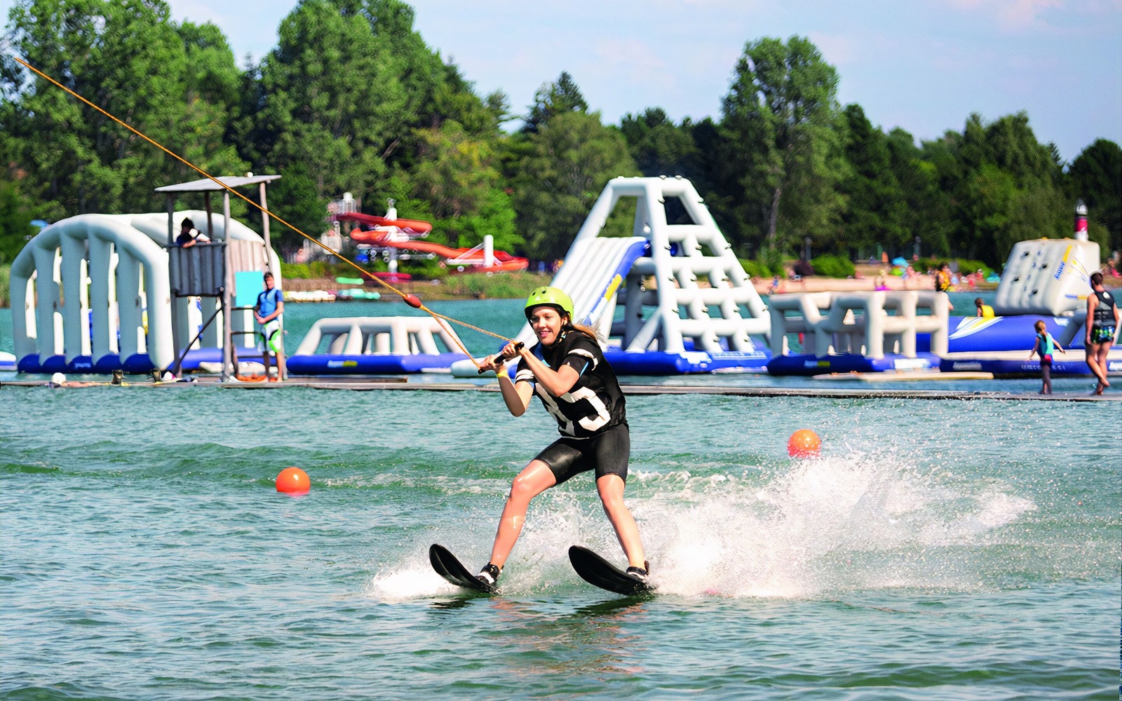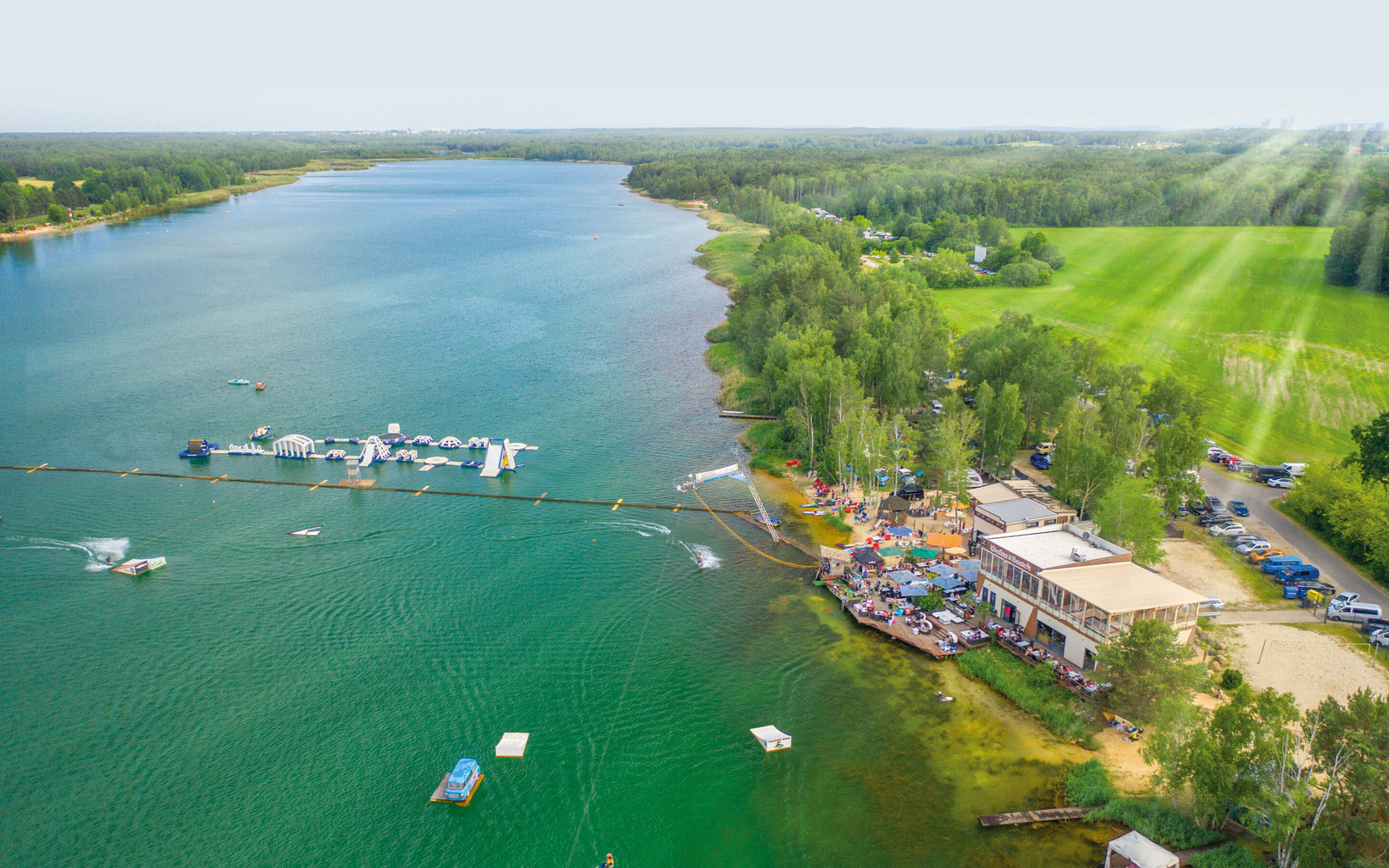 Aquapark: Direkt neben der Wasserski- und Wakeboard Anlage gibt es einen Aquapark für Groß und Klein. Garantierter Spaß auf fast 1000 m² Aktionsfläche. Neben 5 m hohen Rutschen, Kletterwänden und Wassertrampolinen gibt es auch einen Parcours für die Kleineren.