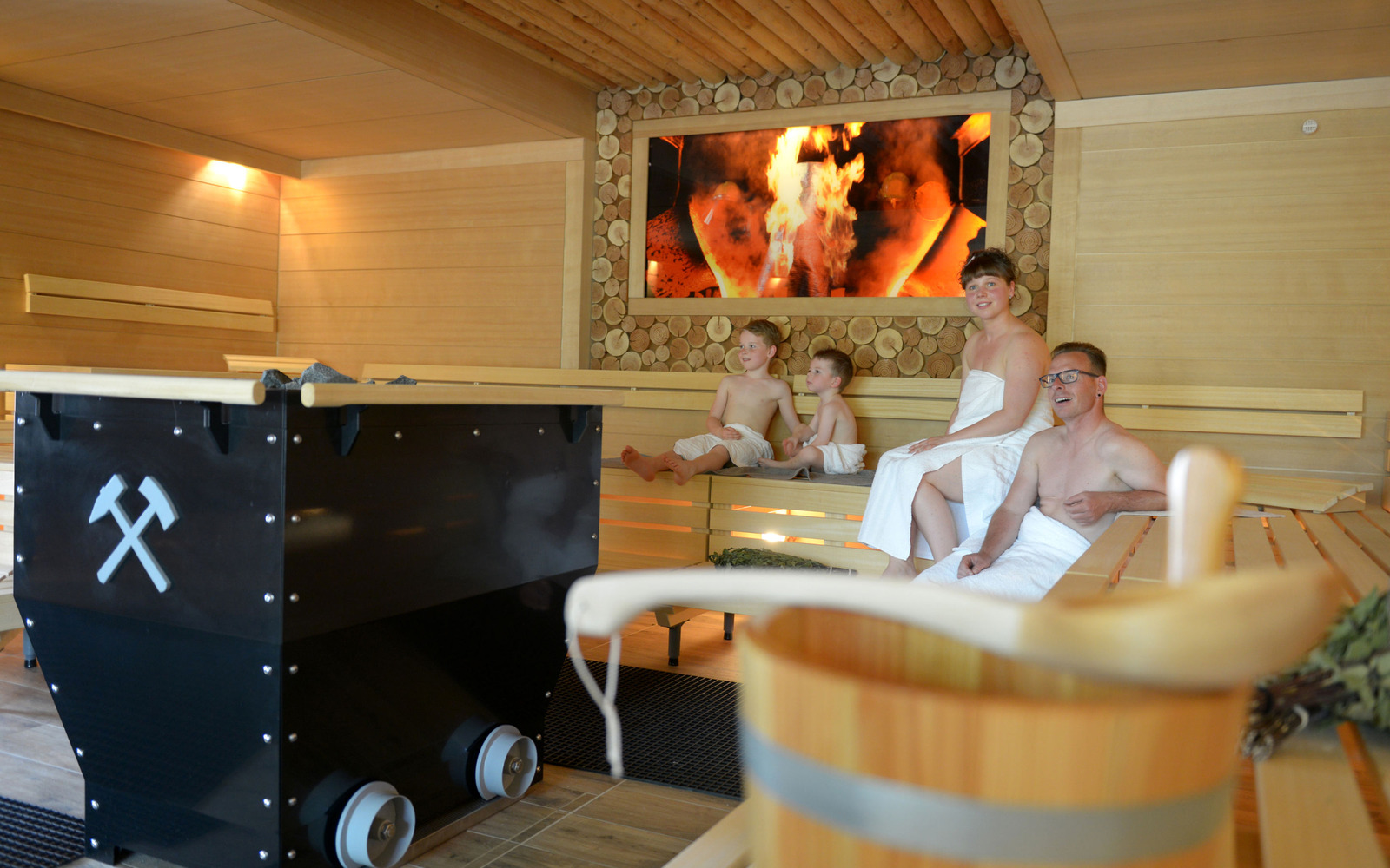 Der gemütlich gestaltete Saunabereich vereint auf einer Fläche von etwa 1.500 m² eine Vitamin-Sauna, eine Finnische Sauna, eine Blockhaus-Sauna, eine große Bergmann-Sauna für bis zu 45 Personen sowie ein Dampfbad mit Sternenhimmel. Für die Abkühlung nach dem Saunagang erwarten Sie eine Kaltduschwand mit verschiedenen Wasserstrahlarten und –intensitäten und ein Tauchbecken mit ca. 8°C Wassertemperatur. Ebenso stehen Ihnen Fußwechselbecken zur Verfügung, mit denen Sie sitzend auf beheizten Marmorbänken ausgiebig kneippen können. Zwischen den Saunagängen haben Sie die Möglichkeit im regional angelegten Saunagarten Frischluft zu tanken oder im Ruhehaus mit separatem Familien-Ruheraum am Kamin zu entspannen. Wer es gesellig mag, trifft sich mit anderen Gästen im Gastronomiebereich oder nutzt die wohlige Wärme des Warmhaltebeckens für einen kleinen Plausch.