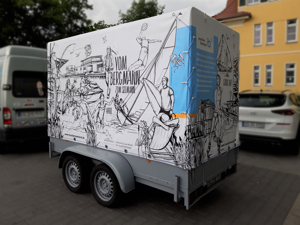 Der Anhänger des Modellbahn- und Puppenvereins Neupetershain wurde dreiseitig mit den eindrucks-vollen Illustrationen versehen, die für das Lausitzer Seenland werben. Der Verein ist deutschlandweit das ganze Jahr über auf Messen und Präsentationen unterwegs.