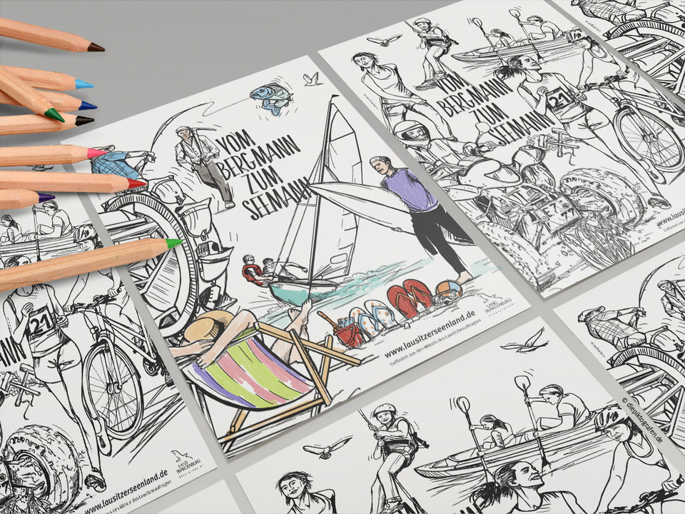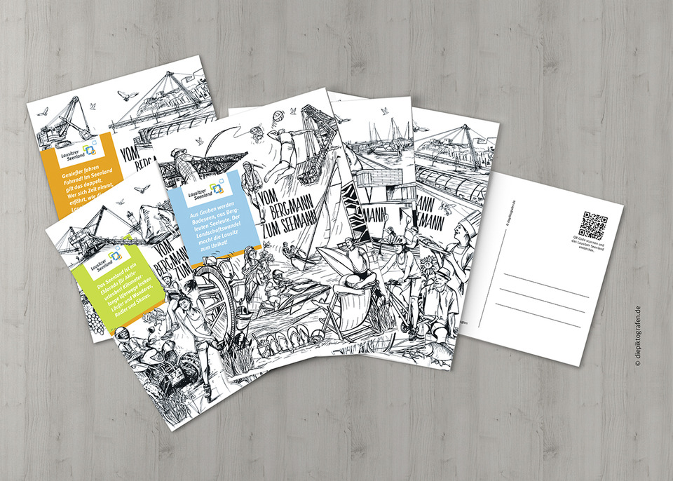 Drei verschiedene Postkartenmotive mit eindrucksvollen Illustrationen und kurzen Texten sollen die Aufmerksamkeit auf sich ziehen. Die Illustrationen zeigen touristische Highlights der Region, typische Urlaubsaktivitäten und Maschinen und Geräte aus dem Lausitzer Bergbau. Als Souvenir für Gäste liegen sie in den regionalen Touristinformationen und bei touristischen Anbietern aus. Sie werden auch bei Prospekt- und Produktversand beigelegt. Die Grundschulen im Verbandsgebiet nutzen die Postkarten als Arbeitsmaterial für ihre Schüler.