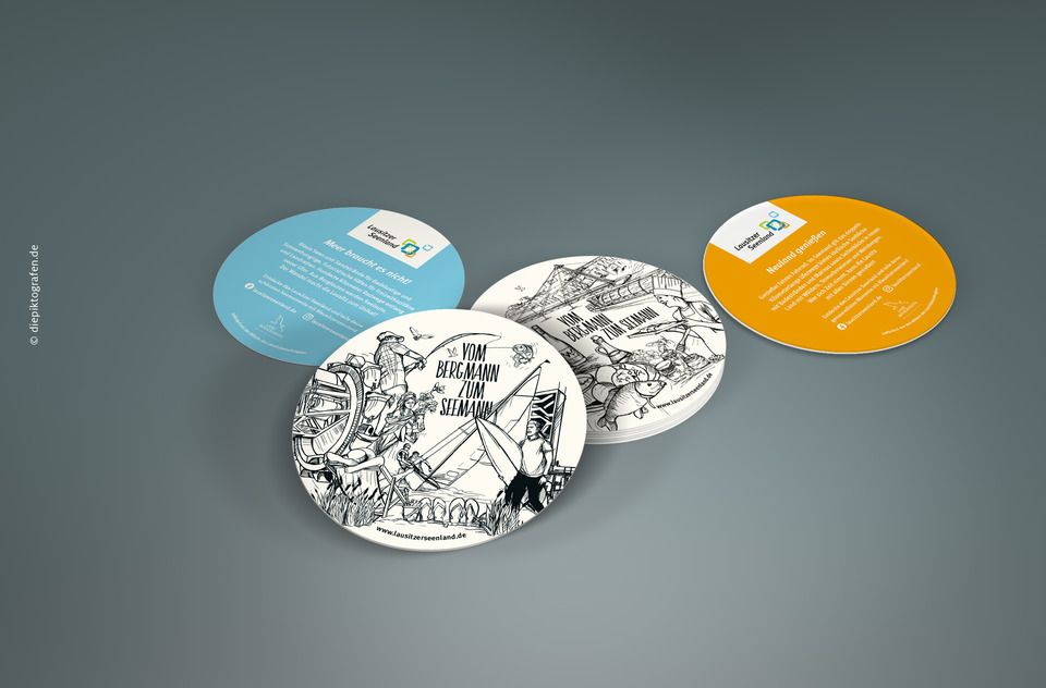 Urlauber und Einheimische sollen mittels der Bierdeckel in den Restaurants, Cafés und Gasthöfen im Lausitzer Seenland auf die Urlaubsregion mit ihren Highlights und Aktivitäten aufmerksam werden. Auf der Vorderseite sind die Illustrationen abgebildet. Auf den blauen, grünen und orangenen Rückseiten wird mit „Meer braucht es nicht“, „Bewegung im Revier“ und „Neuland genießen“ für das Lausitzer Seenland geworben. Partnern stellen wir die Bierdeckel zur Verfügung.