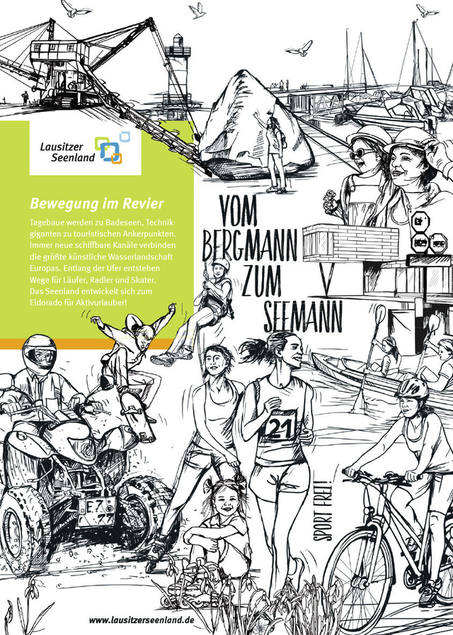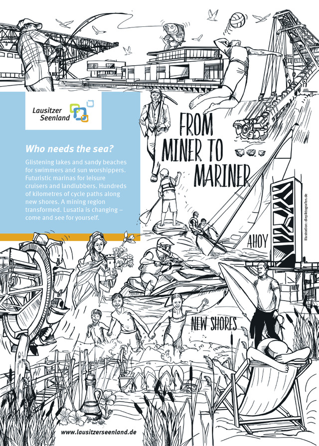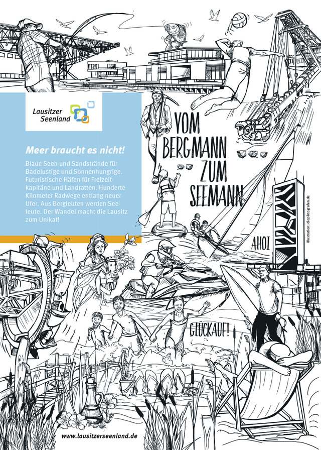 Die Kampagne schafft Aufmerksamkeit für den einmaligen Wandel vom Bergbaurevier zur Urlaubsregion. Gemeinsam mit der Agentur Die Piktografen GmbH und der Textwerkstatt Ute Baumgarten wurden Illustrationen entwickelt, die Einheimischen und Urlaubern die Geschichte des Lausitzer Seenland verständlich und positiv vermitteln. Entstanden sind Bilder, die viel erzählen. Die Illustrationen zeigen beispielhaft neue Häfen, Förderbrücken, schwimmende Häuser, Bergbaugeräte, Leuchttürme, Bergmänner, Schiffe und Urlauber, die Radfahren, Baden oder Boot fahren.