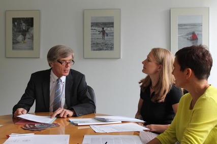 Burkhard Jungkamp, Koordinator des Handlungskonzepts „Tolerantes Brandenburg“ und Bildungsstaatssekretär im Land Brandenburg, Kathrin Winkler, Beiratsmitglied der ENERGIE-Route und Geschäftsführerin des Tourismusverbandes Lausitzer Seenland e.V. und Antje Boshold, Projektkoordinatorin Interessengemeinschaft ENERGIE-Route der Lausitzer Industriekultur (v. l. n. r.) nach der Unterzeichnung der Kooperationsvereinbarung in Potsdam