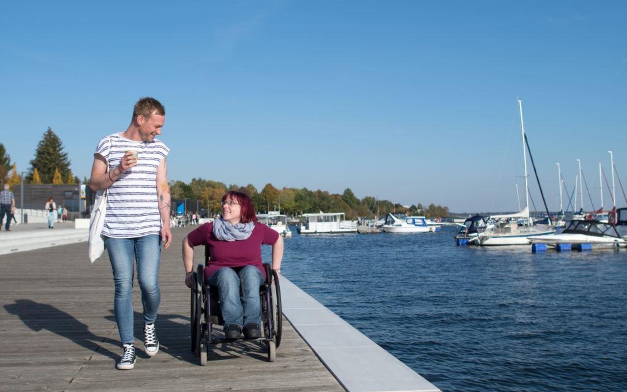 Foto Rollstuhlfahrerin und Begleiter am Stadthafen SenftenbergBildnachweis: Tourismusverband Lausitzer Seenland / Nada Quenzel (JPG; 1,72 MB)