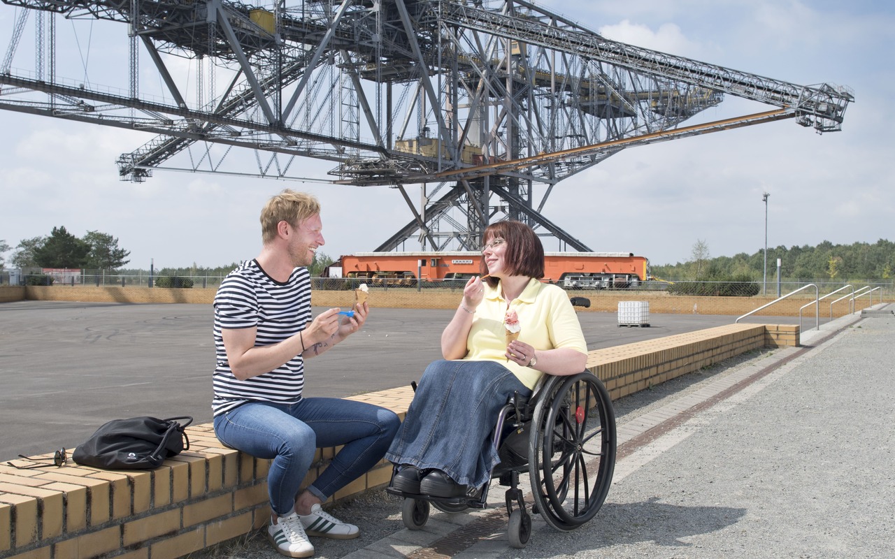 Foto Rollstuhlfahrerin und Begleiter am Besucherbergwerk F60Bildnachweis: Tourismusverband Lausitzer Seenland / Nada Quenzel (JPG; 2,38 MB)