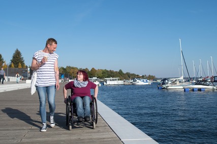 • Foto Rollstuhlfahrerin und ihr Begleiter am Stadthafen Senftenberg©Tourismusverband Lausitzer Seenland, Nada Quenzel (JPG; 1,72 MB)