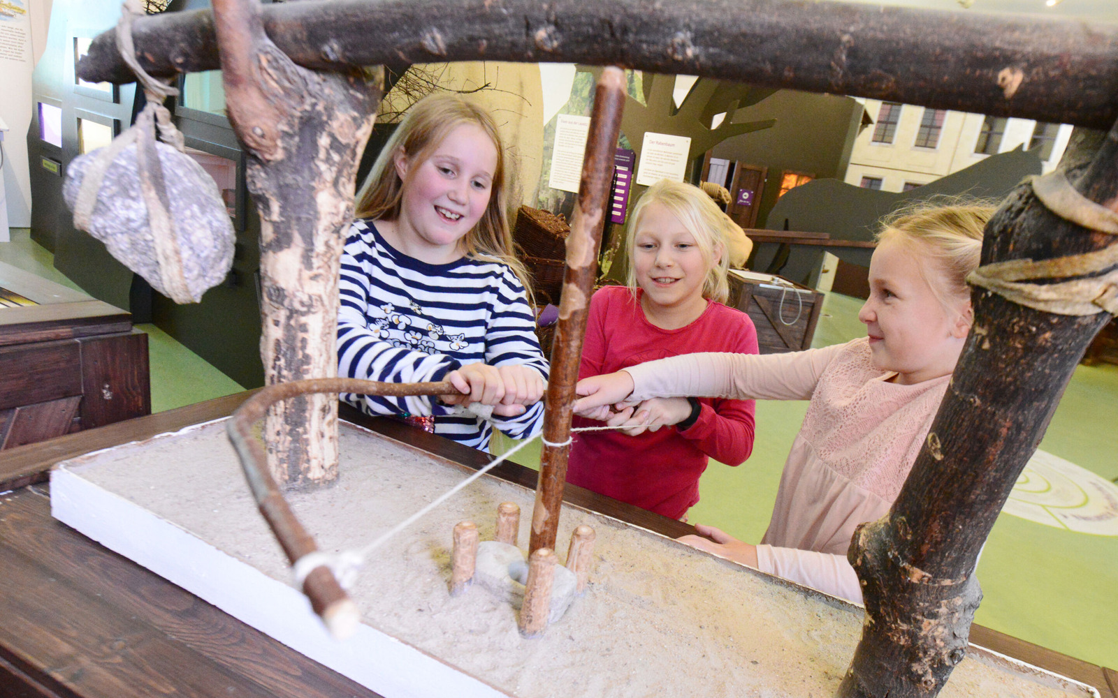 In “ErlebnisReich”, families can stroll through the ages, from prehistory to the present day. You can also discover hidden treasures in an archaeological excavation site and try out a stone drill. Children can take a peek at our ancestors’ essential supplies, put out a town fire, and take a seat at the desk of the former lady of the castle, Katharina von Teschen.