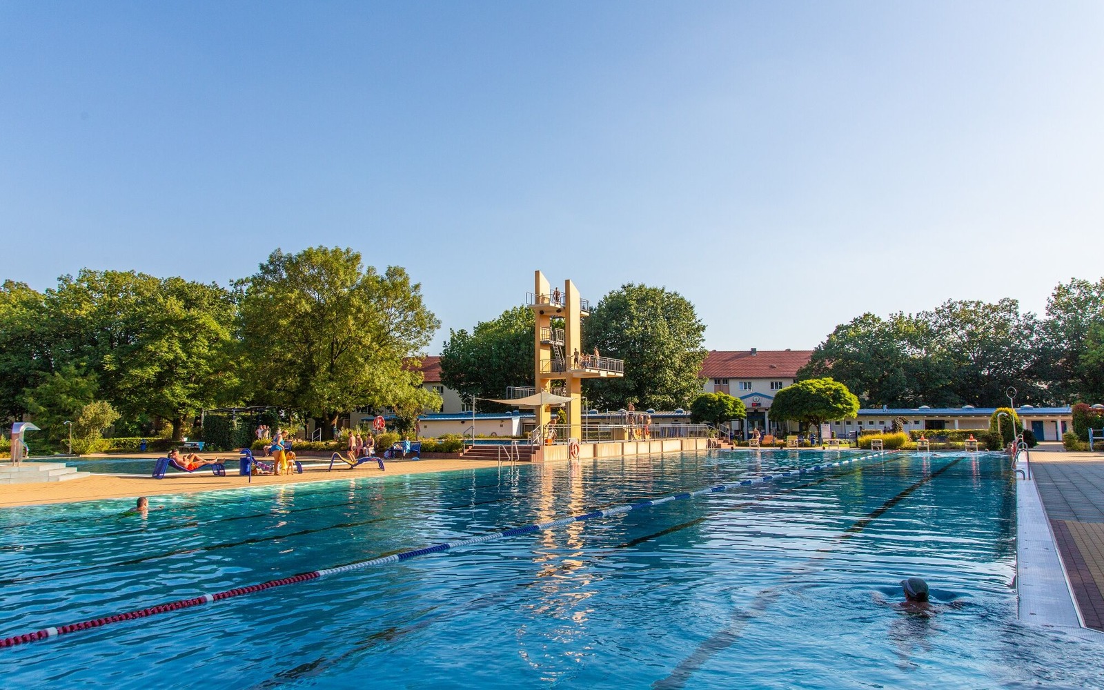 The sports and adventure open-air pool in Forst (Lausitz) is an attractive destination for guests of all ages. The open-air swimming pool features a number of different pools for children and grown-ups. Kids enjoy the wide water slide, splash showers, floor jets and water mushroom in the non-swimmer pool. For grown-ups, there are massage loungers and a swimming pool with six 50 metre lanes. Those who are not scared of heights can use the 1, 3, 5 and 10 metres tall diving towers. For the youngest guests, there are two paddling pools with a water hedgehog, water spout and a little slide hill. A sandy playground for children and leisure sports facilities cater for those who prefer to stay on land. Guests can let off some steam playing football, handball, basketball, volleyball or table tennis and then relax on the big sunbathing lawn.